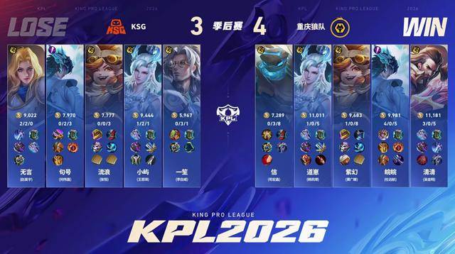 14分钟狼队上高地,鲁班大师跳上来想清龙,信的盾山二闪背到无言和一笙,将两人全部击杀。KSG只剩下三人,盾曹合体把流浪逼回泉水,虽然盾山倒了,但句号的大司命一打多根本扛不住。主宰先锋还剩最后一丝血,小屿大招向前飞已经来不及了,最终狼队完成了让三追四的奇迹。