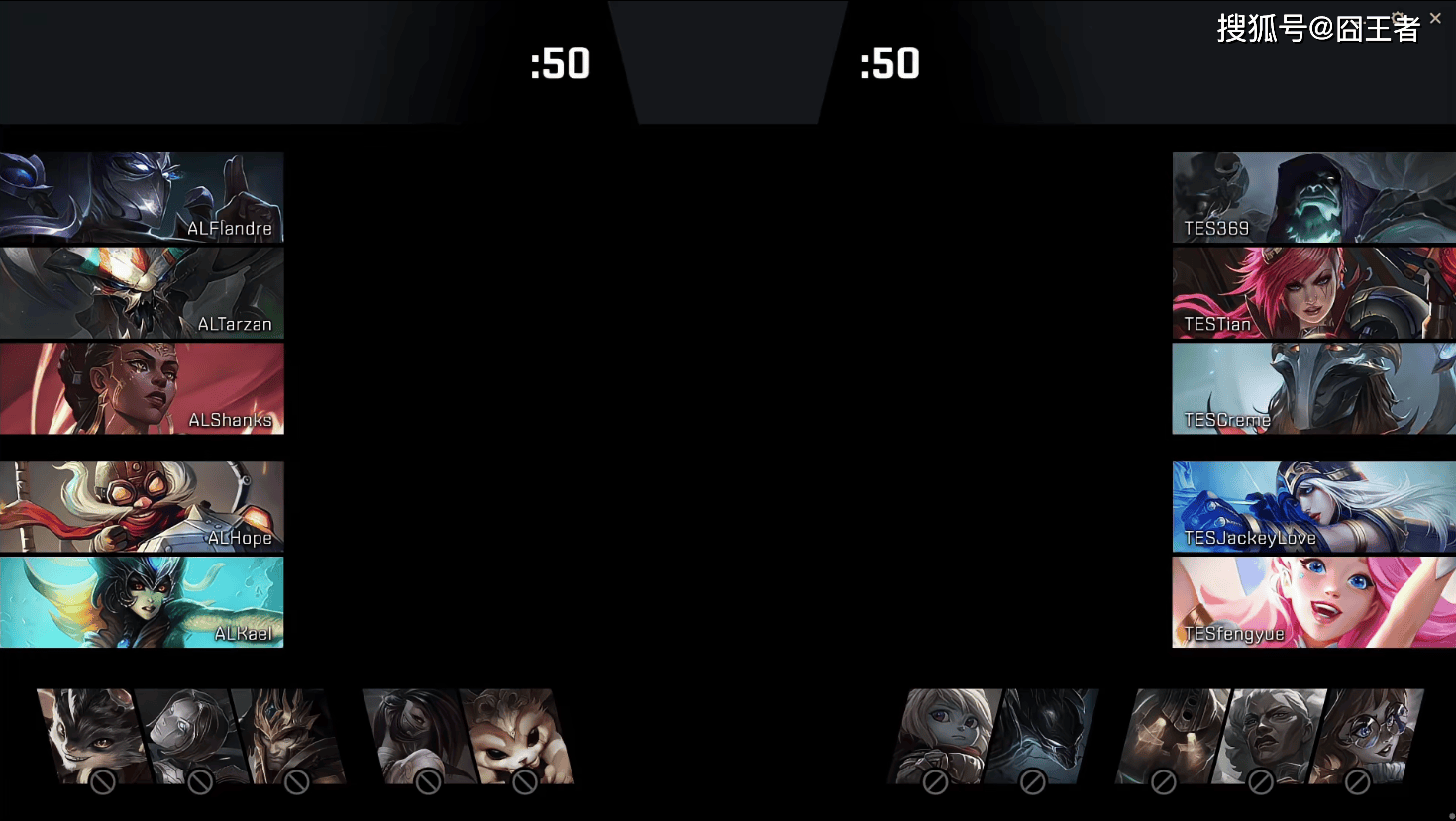 第一局比赛,TES蓝色方,禁用:发条、艾希、皇子、娜美、泰坦,选用:369鳄鱼、Tian赵信、Creme沙皇、JackeyLove韦鲁斯、fengyue璐璐;AL红色方,禁用:阿卡丽、卡尔玛、兰博、芸阿娜、希维尔,选用:Flandre塞恩、Tarzan潘森、Shanks瑞兹、Hope伊泽瑞尔、Keal巴德