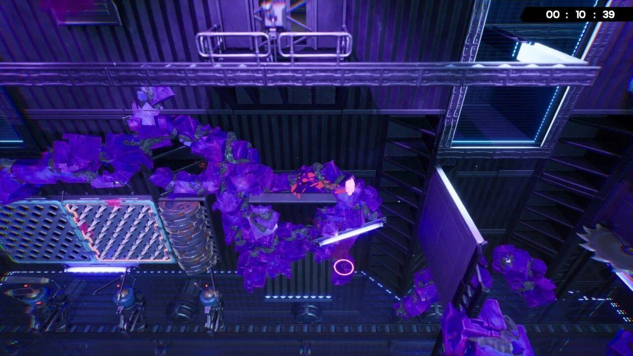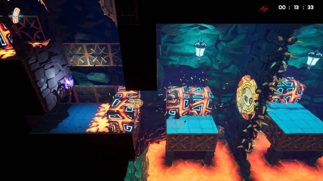 导弹与陷落的地面则是 timing 类机制,需要看准爆炸、下落时机躲开。3D 平台特性是上下左右没有空气墙,很容易掉出去死掉,但同时也给了更多操作的可能性,爆炸前跳出平台,利用滞空时间躲伤害判定,然后再按下冲刺回来,未尝不能成为一种偷鸡解法。
