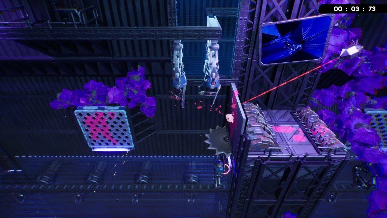 另外关卡里的毒气、尖刺、激光、齿轮等等障碍物,摆放得也很有讲究。以 3-8 关为例,开局就能看到左右两边的板子会下砸,因此要找时机穿行,然后前方又有激光旋转挡路,扒墙等 timing 还要注意小跳,跳大了上方齿轮也会要你命,紧接着还有斜向跳跃考验距离把控。