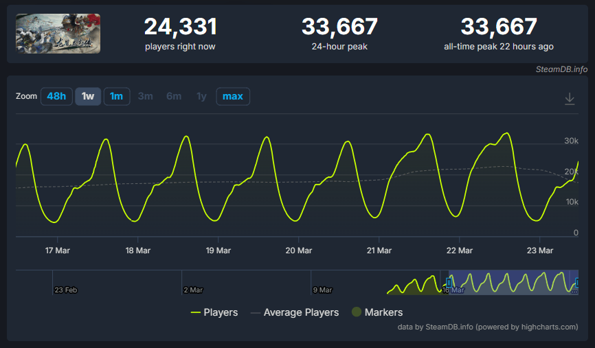 但也正因为如此,它后来的表现才更耐人寻味——发售两周后,游戏的在线人数不但没有迅速回落,反而一路往上爬,峰值基本稳定在3万人附近。