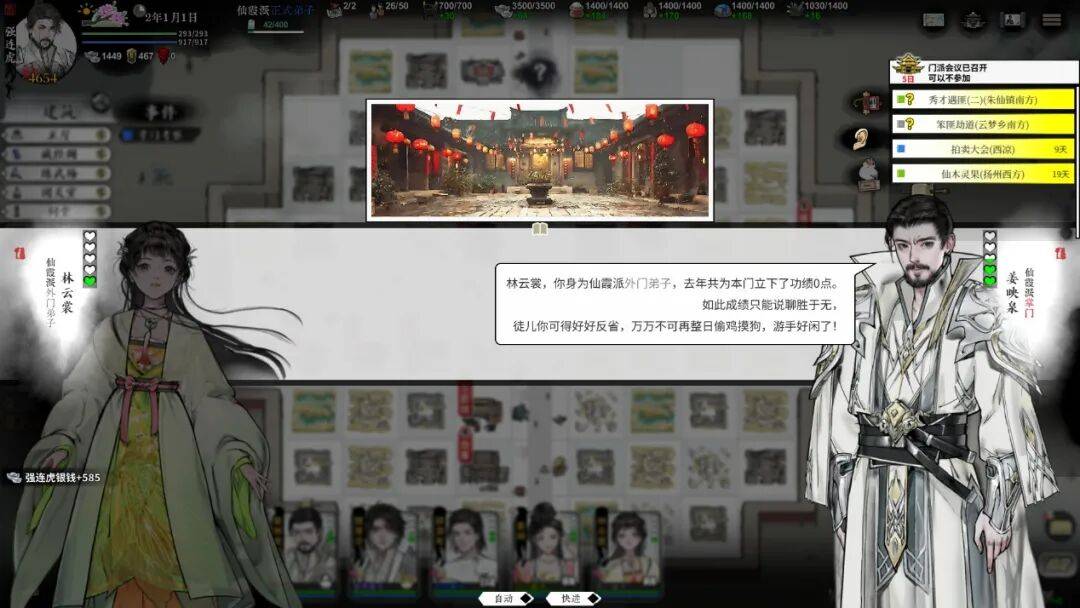 随机事件中还有近乎 “地狱笑话” 的桥段:前中期刚因盗匪失亲的小师妹入派,却在事件“春节汇报”里,被掌门以功绩为零当众斥责“游手好闲”,剧情逻辑和定期的玩法事件完全脱节。