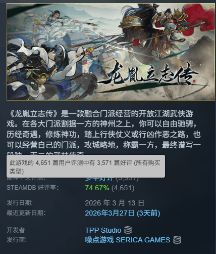 这款3月13日发售的武侠RPG,至今已有四千多条Steam评价、76%的整体好评率,光看数据,虽是一匹黑马,恐怕却称不上一等一的佳作。