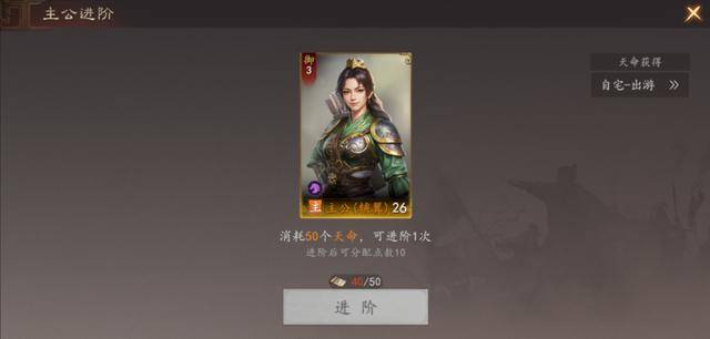 其次主公进阶所需的“天命”主要由游历和出游产生,且每日获取的数量固定,意味着所有玩家的主公的红度保持一致,进一步缩小了与氪佬之间的差距。