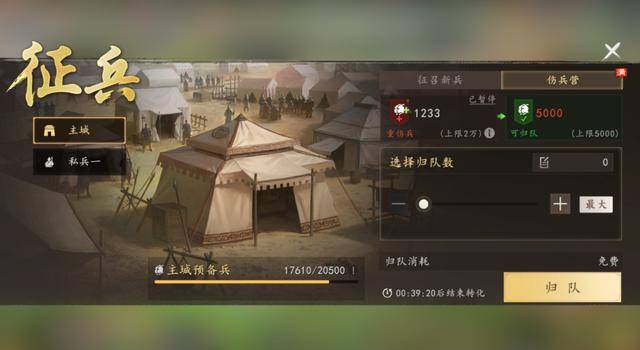 其次是兵力损耗对开荒玩家友好。开荒期兵力算是十分珍贵的资源,一次高损伤的翻车需要很长时间才能缓过来,还会拖慢发育节奏。《三国志:王道天下》中,战斗损兵按照一定比例转化为重伤兵,重伤兵在伤兵营治疗,并重新回到队伍,而且伤兵救治并不会消耗资源,完全免费。