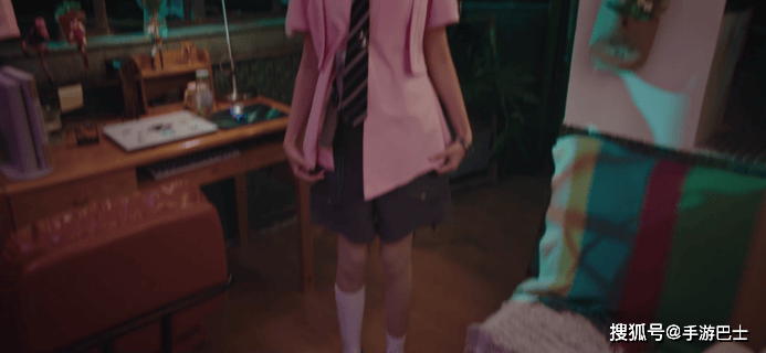 回到你的家中,星见换上了你的粉色工装衬衫与灰色短裤,袜子搭配了一只中筒袜与一只短袜,鞋子换上了更加日常舒适的运动鞋,看起来更像是一位喜欢宅在家里的电竞少女。