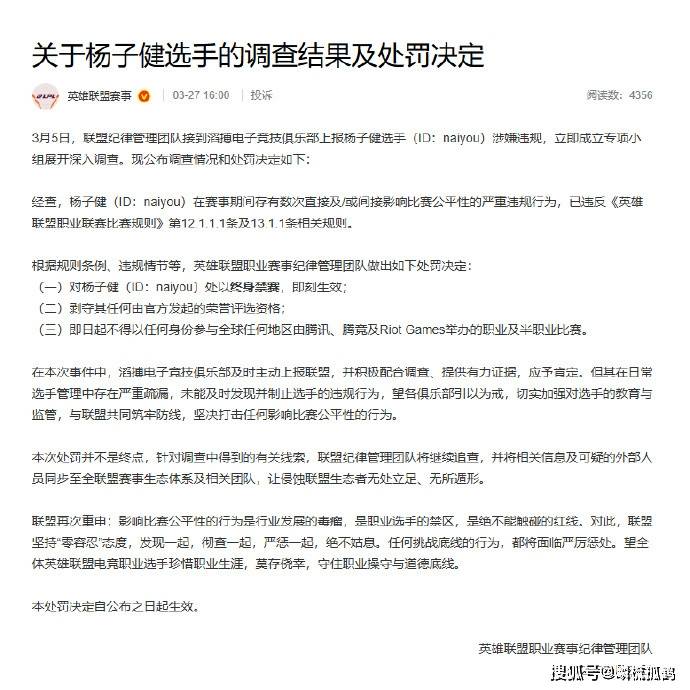 最近,TES前上单wayward放出厥词,他表示“naiyou现在爽得一批,百万撤离(暗戳戳表示假赛收益大),还没有任何处罚,最多名声差了点。”这话不难听出是有点羡慕之情的,但假赛这种毒瘤对联赛危害之大谁都知道,作为前职业选手,居然能说出这种话,足以见得假赛这种事在职业选手圈子已经泛滥成什么样子了。