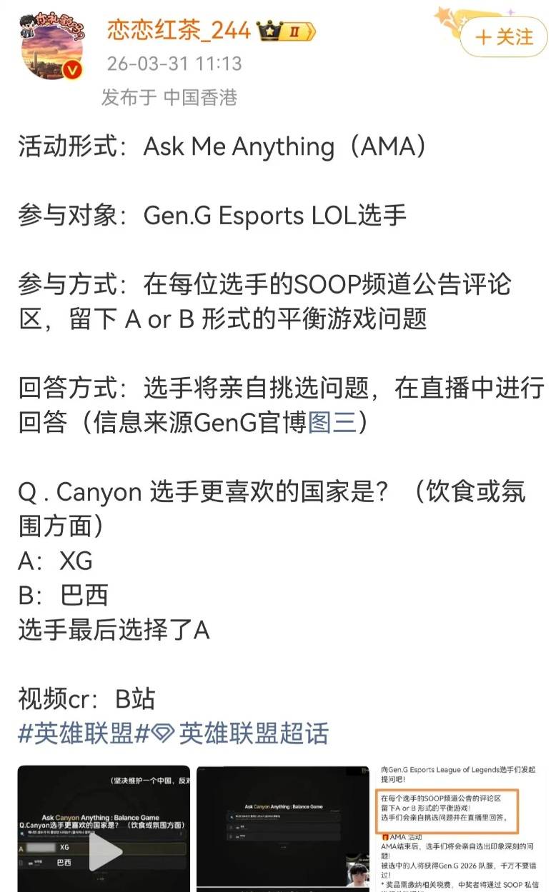 而除了Ruler逃税避税的事件外,GEN场外也再度爆雷,在近期的GEN战队Canyon直播问答环节中,官方给选手发布了明显带有不正当表述的问题,来让选手回答,问题是问Canyon:更喜欢哪个国家(从食物与氛围来说)。