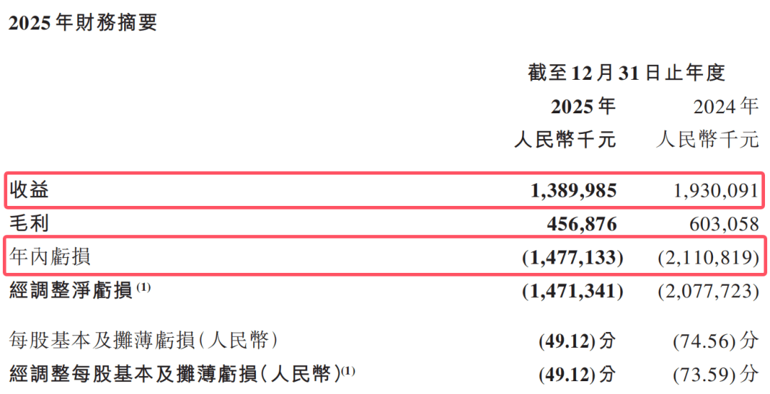 数字有点“惨”,营收为13.9亿元(人民币,下同),同比减少28.0%;年内净亏损14.77亿元,相比2024年的21.1亿元亏损少一些,但依然有不小的窟窿。