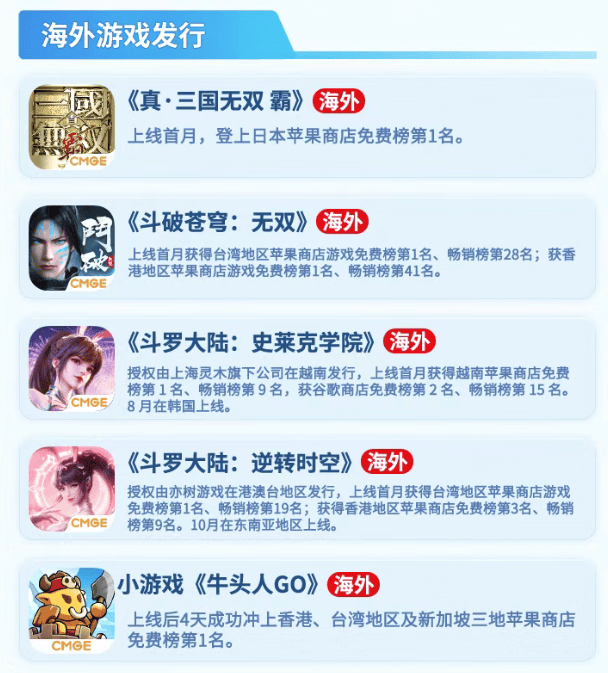 其中,《斗破苍穹:无双》上线首月即拿下台湾、香港地区苹果商店游戏免费榜第1名;《真·三国无双霸》进军日本市场首月也登上日本苹果商店免费榜第1名。