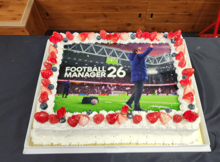 尽管《足球经理》系列已有悠久的历史,但该系列直到2023年的《足球经理24》才首次推出官方日语版(比2017年就推出的官中版晚不少)。本次活动则是第一次在日本境内举办的《足球经理》官方与粉丝见面会。现场也摆放着以《足球经理2026》主视觉图为主题特别制作的大尺寸蛋糕。