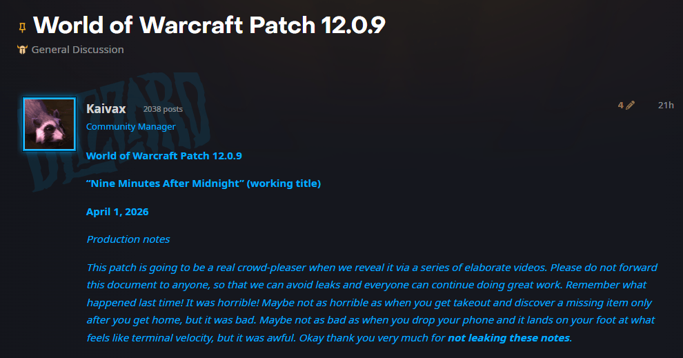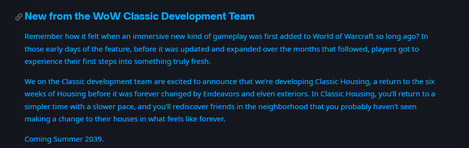 然后是4月1日的蓝贴,暴雪在愚人节发了一条12.0.9的补丁说明,预告下下个版本的玩法内容,其中竟然提到怀旧服,称正在开发家宅玩法的经典旧世版本,预计将在2039年夏季上线(要等13年)。