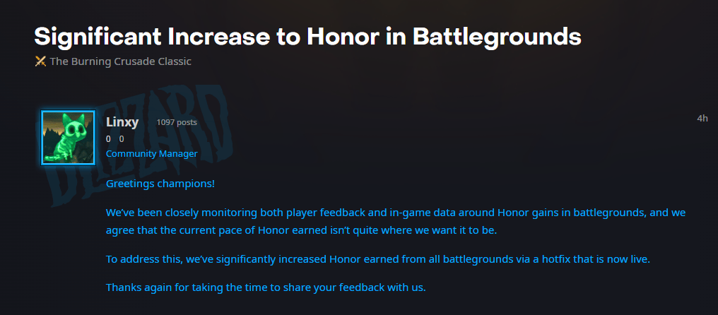 暴雪4月2日蓝贴,周年服TBC迎来荣誉改动。暴雪称一直密切关注玩家对于战场荣誉的反馈,也对游戏内的数据作了监测,现在认同大家看法:荣誉获取速度太慢。为解决这一问题,暴雪已发布热修补丁,大幅提高了战场荣誉的获取量。