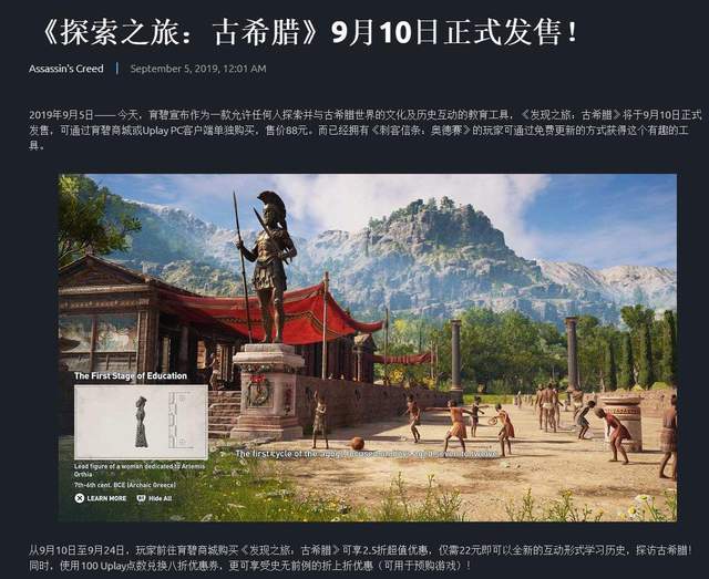 2019年,育碧就推出了“旅游模式”——《发现之旅:古希腊》并免费提供给《刺客信条:奥德赛》的玩家。