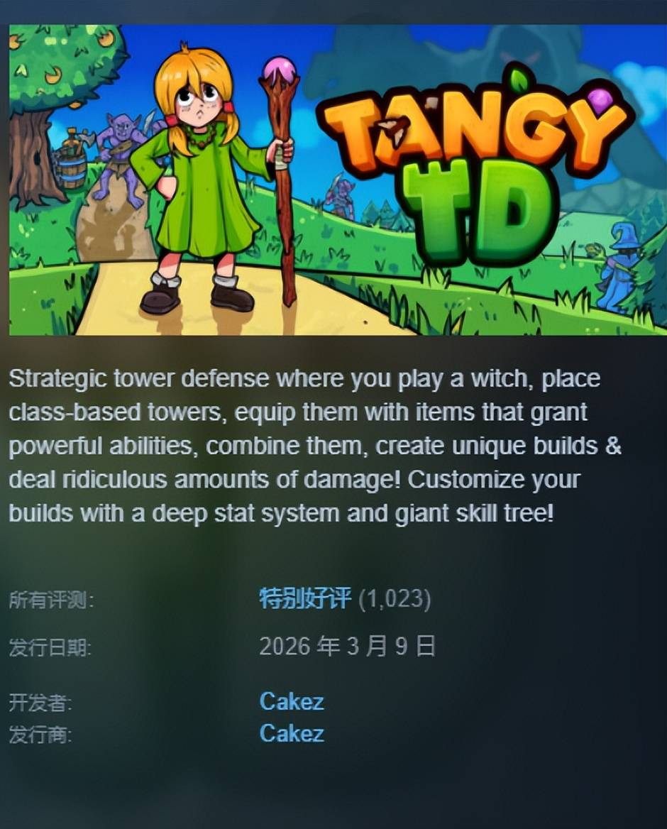 直至今年3月初,《Tangy TD》总算是提前上线了。虽然算不上十全十美,但这部融合了肉鸽与塔防的作品还是获得了一大批玩家购入,达到了92%的好评率。