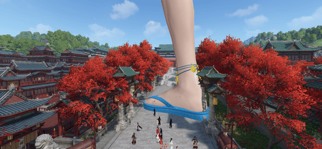 而后,又有玩家发现,只要服用“强效萌宠变身丸”并跟自己的好友使用牵手动作,就能将他的体型变大,重复使用该机制,甚至能将对方变成坐下就能覆盖一座城的超级巨无霸!