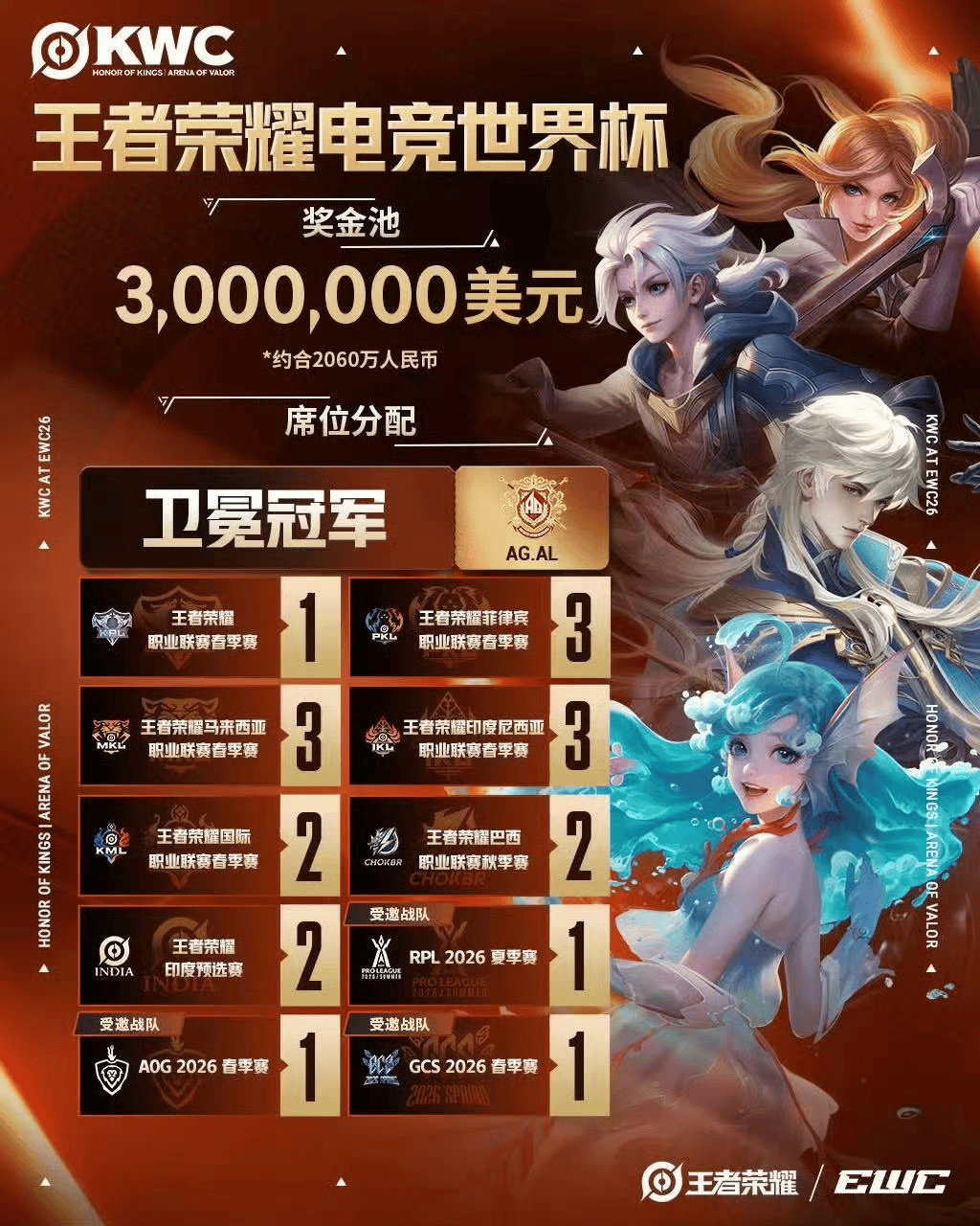 今年3月27日,《王者荣耀》电竞夏季最高规格的赛事——与EWC合作举办的王者荣耀电竞世界杯(HONOR OF KINGS WORLD CUP AT 2026 ESPORTS WORLD CUP,简称KWC at EWC26)公布了新赛季规划:总奖金池300万美元,共有20支战队获得参赛资格。