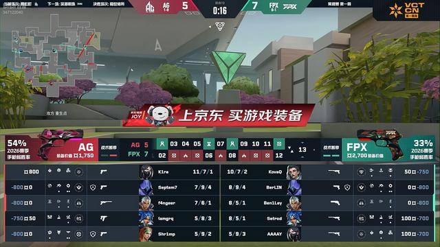 上半场最后一个回合K1ra四杀收尾,比分来到FPX7-5AG。