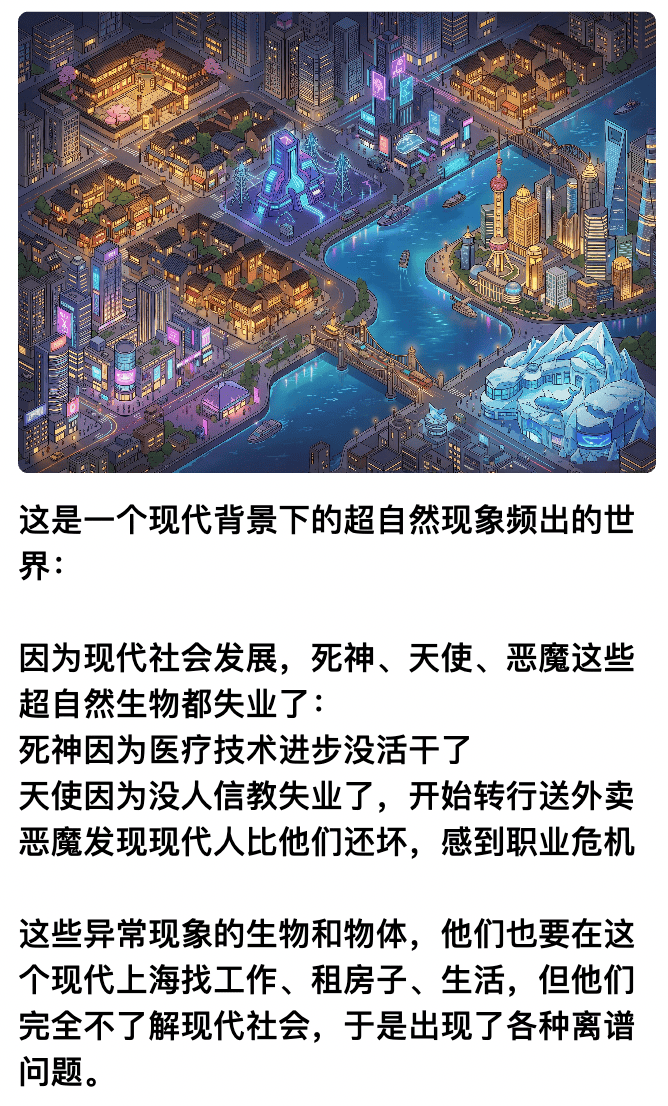 比如魔都上海的背景是社会发展后神明集体失业:在水族馆骑北极熊耀武扬威的始皇帝、送外卖老被卡翅膀的天使、在敬老院给老人疯狂续命的死神……整体比宫斗轻松不少,画风、题材、叙事风格都完全不同。
