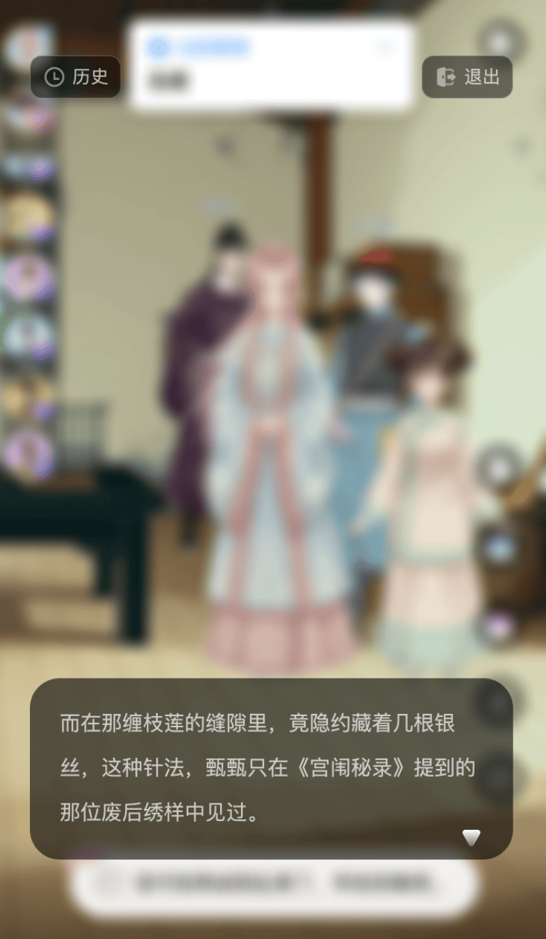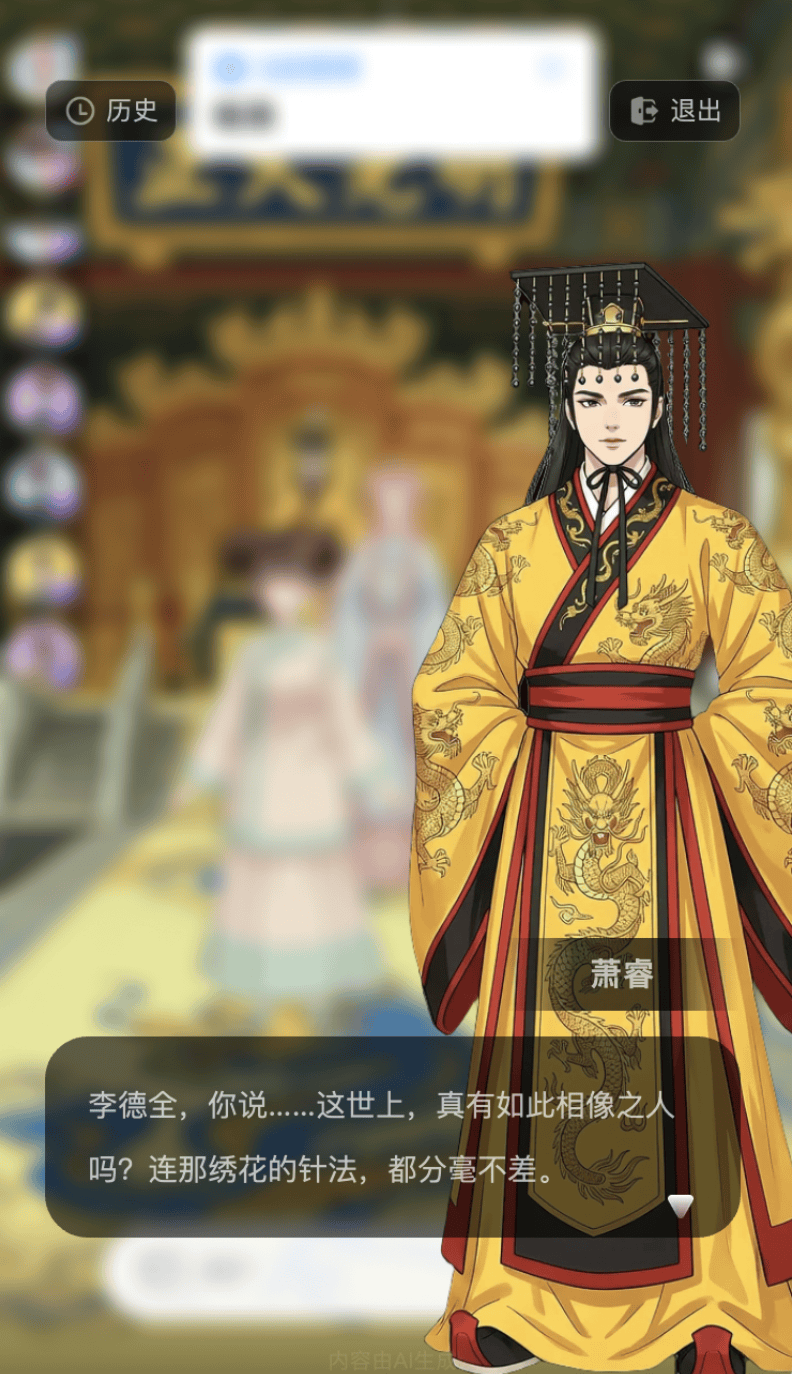 比如我在宫斗世界写下「皇帝喜欢我」的内容。结果你猜怎么着?AI没用俗套的直球,而是让皇帝截胡了我之前给贵妃的绣画,然后憋出一句「像、太像了……简直一模一样」——没错,我成了皇帝亡妻的替身。