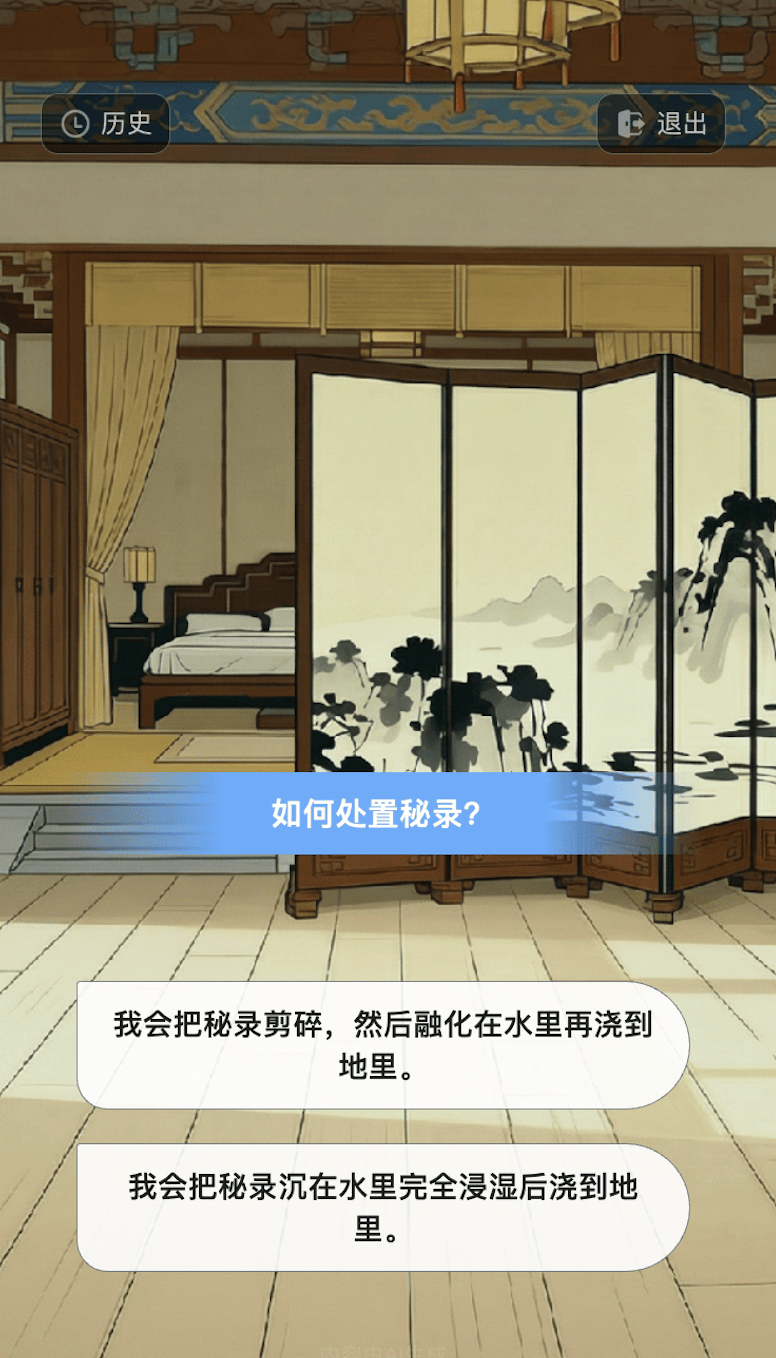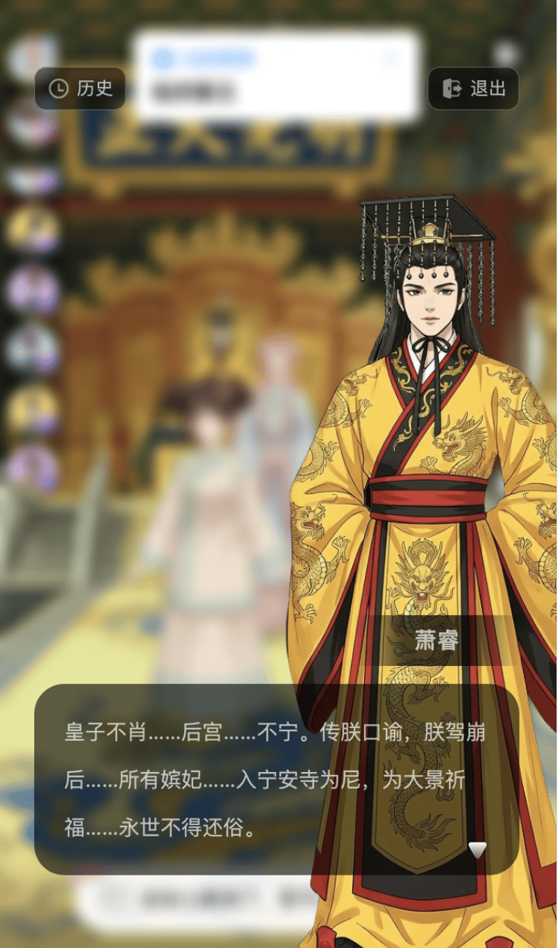 第二次,我写下「皇帝驾崩,全妃入寺为尼为皇帝祈福」。AI查阅律例后觉得符合世界观,啪,下一秒皇帝被迫驾崩,临终前还真情流露,说我是他的最爱,但没办法,我还是得出家。