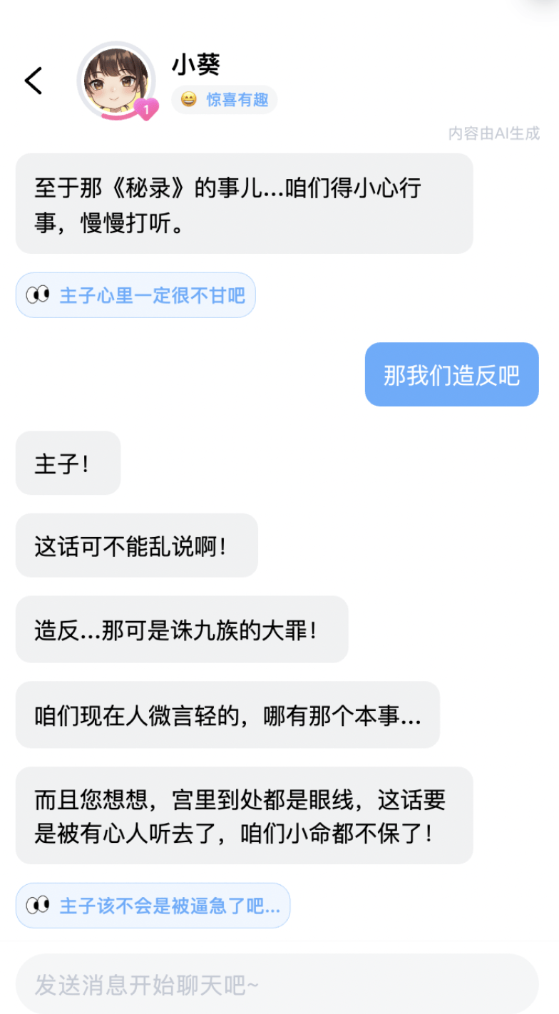 而且AI还能快速把我的离谱剧情拖回正轨:皇帝喜欢我,赐我御用扇子表达宠爱,但我反而看到扇子中的秘密,把扇子……拆了,一心只搞事业——这样的女主我哭死。