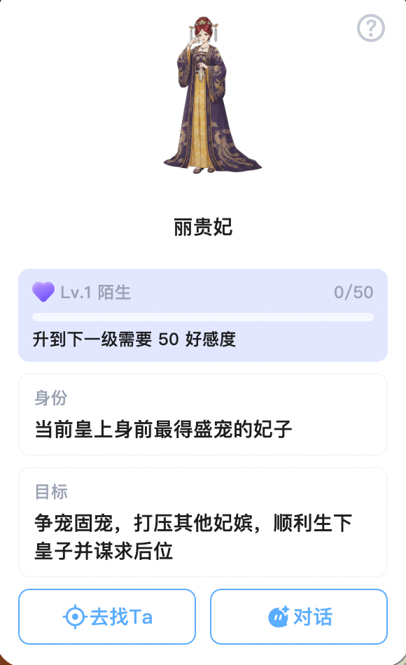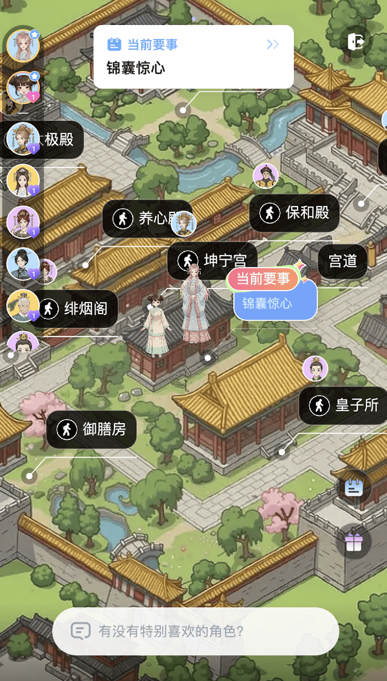 以宫斗世界为例。产品的上手体验可以看作AI版的橙光模拟器,玩家可以带着AI伙伴,在2.5D地图中,通过主线和独立对话跟NPC交流,世界还内置了NPC好感度、礼物、信件等系统。