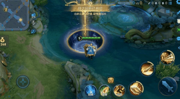 3、玩法介绍:游戏6分钟时,峡谷河道两侧将会生成通往月之回廊的传送阵,踩入传送阵将会传送至月之回廊,同时获得护盾庇护,月之回廊持续60秒。