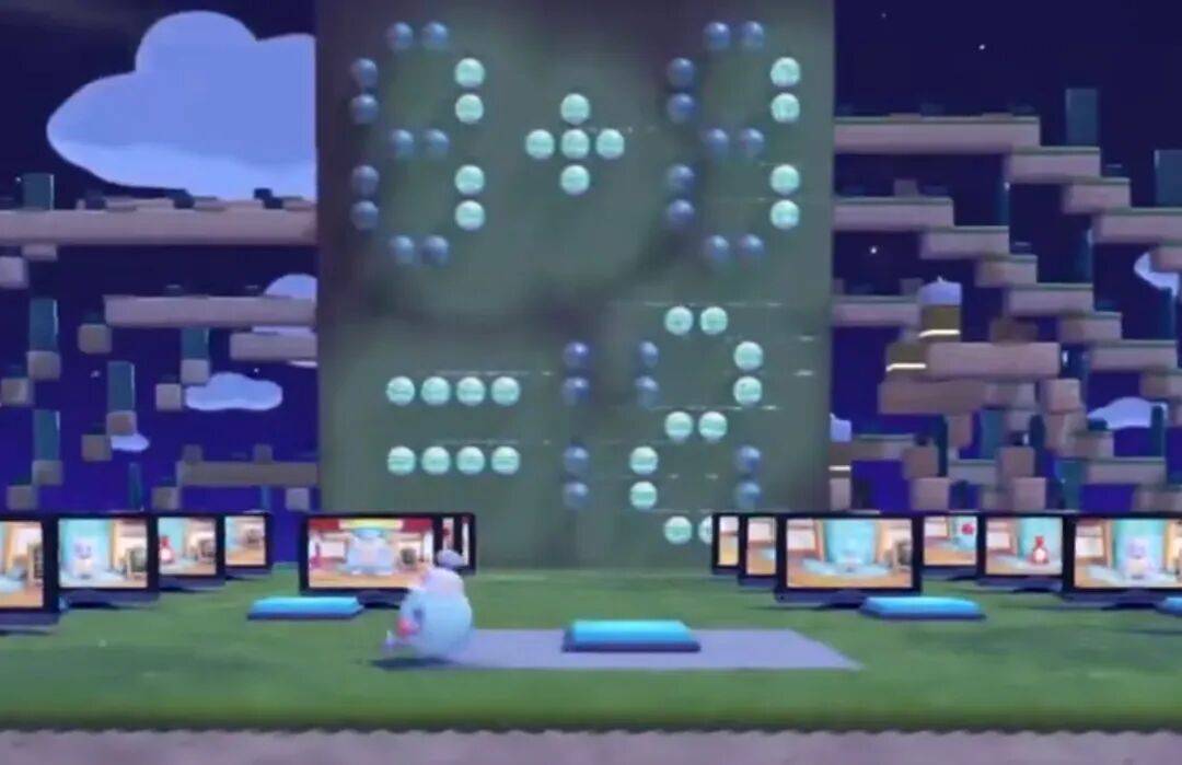 下方的按键区,则是由左右各10块压力板承担了数字键的功能。每个按键前屏幕上显示的宝可梦,用图鉴编号代表了按键对应的数字——如果要算1+1,那就是“妙蛙种子”加“妙蛙种子”。
