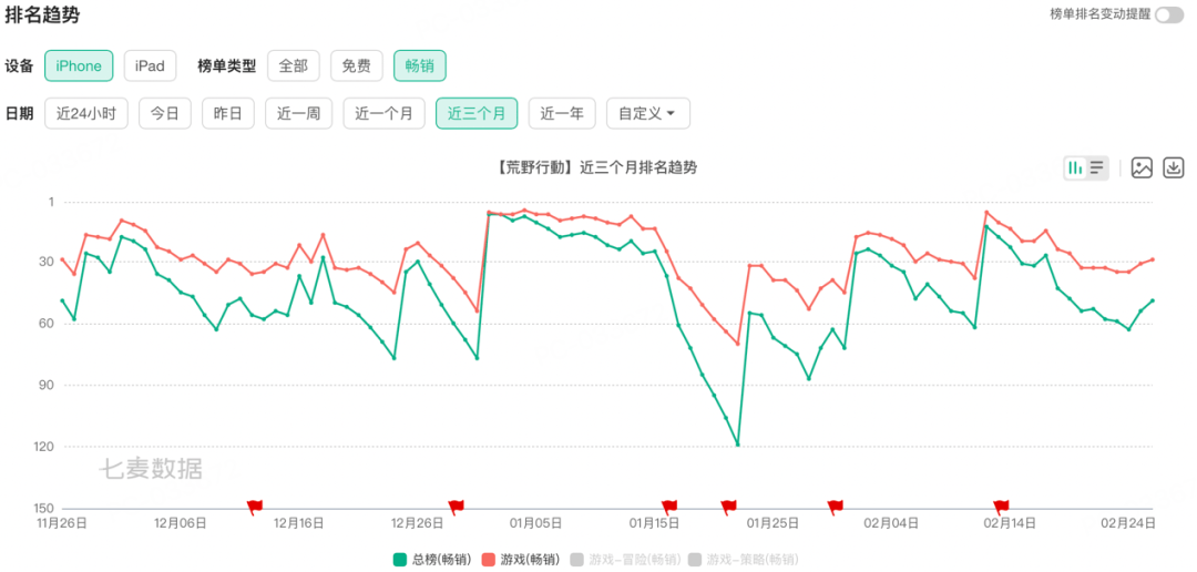 *图片引用《七麦数据》日本iOS畅销榜单,《荒野行动》多次冲顶。据采访后了解,2025年《荒野行动》三方支付比例已达50%+,榜单无法完整体现荒野日服的营收能力