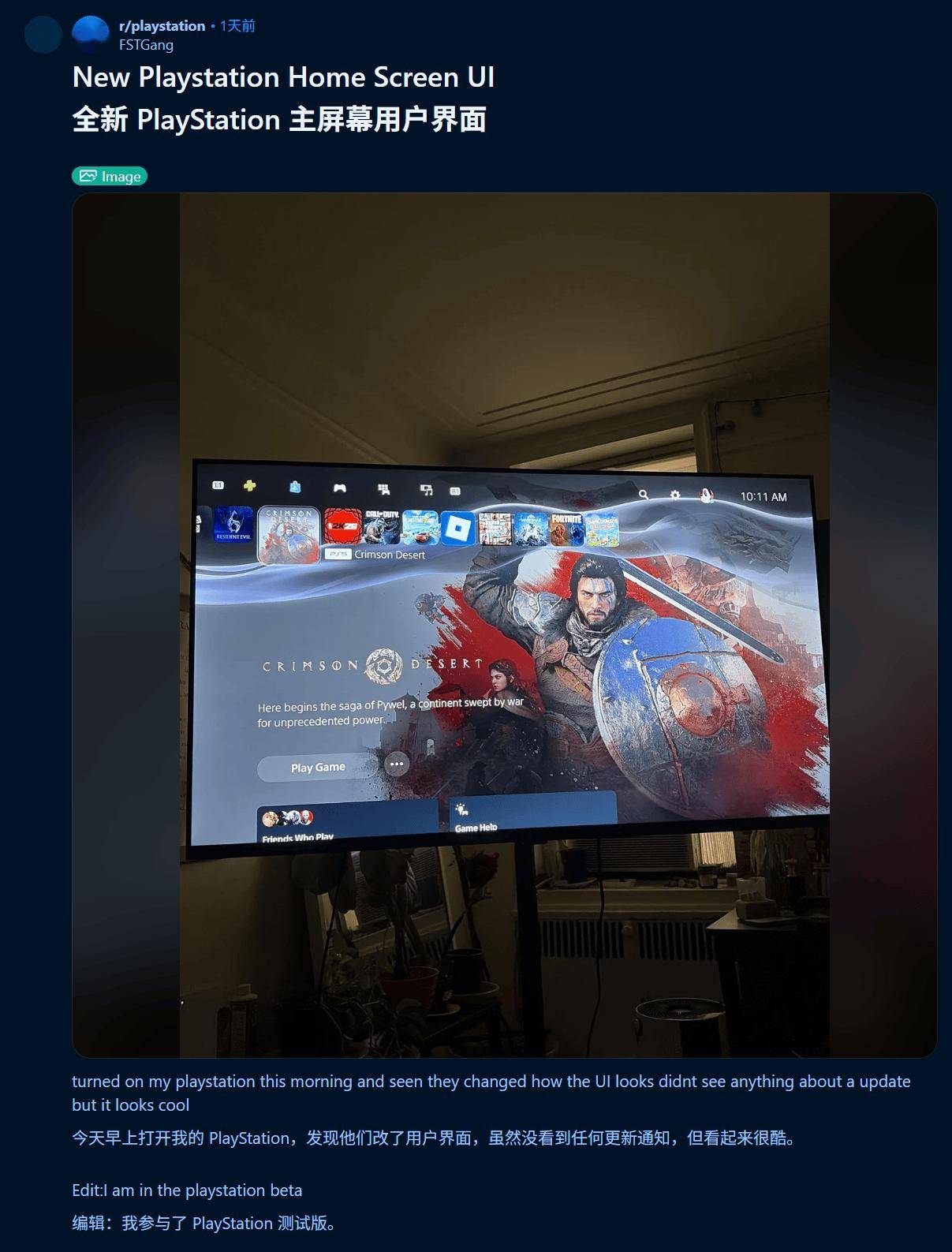 IT之家 4 月 7 日消息,据 Reddit 玩家 FSTGang 昨天发文,索尼正在为 PS5 游戏机测试一套全新主页 UI,将 PS Store、游戏库、PS Plus 等标签拆分。