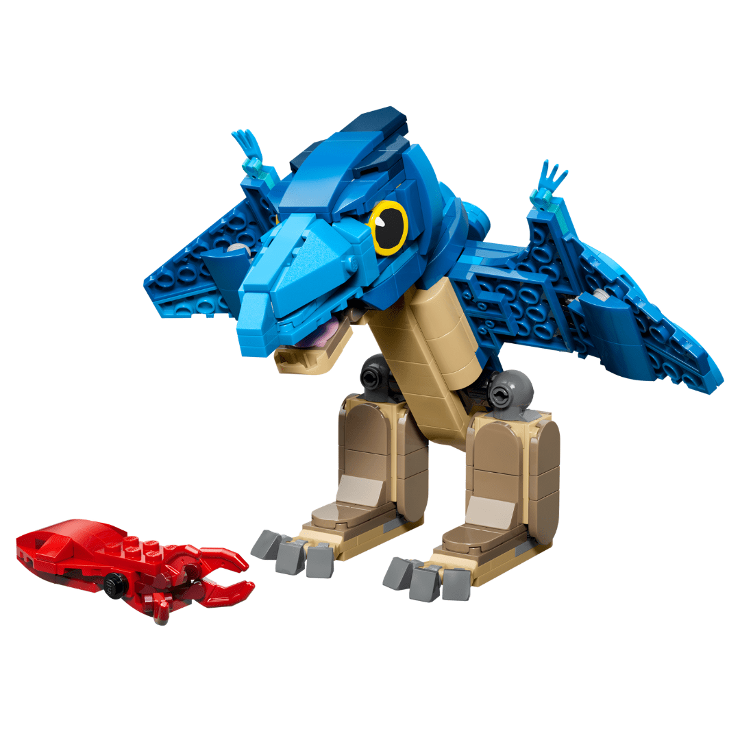 亮蓝+浅棕配色的小翼龙,背部有机关可拍动翅膀,头部、腿部、嘴巴均可动。附带一只红色鱿鱼小模型,适合摆拍或作为桌面小摆件。