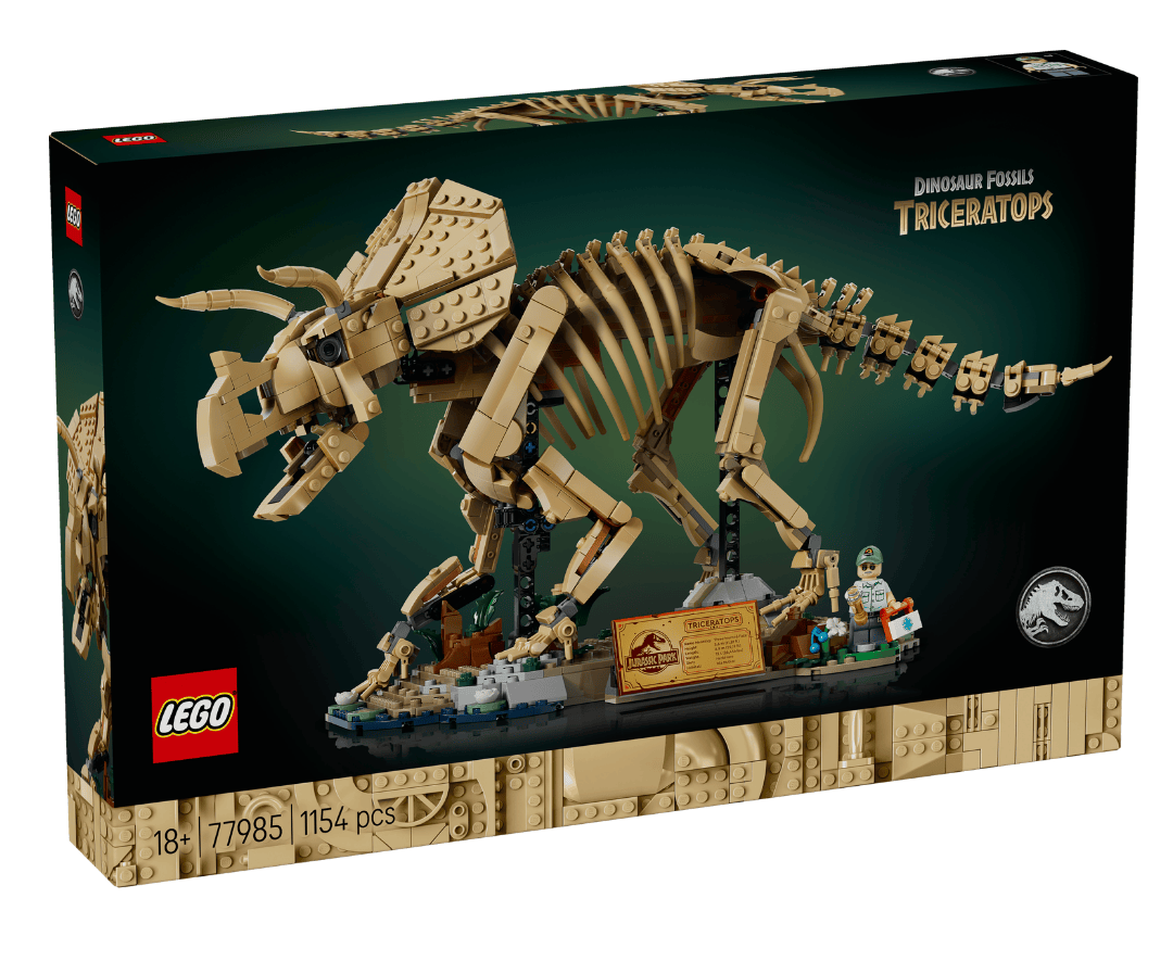 这是继 76968 恐龙化石:霸王龙之后的第二款大型恐龙骨架模型。三角龙骨骼精细,头部、腿部、尾巴可动,下颚可开合。附带湿地/白垩纪展示底座、信息铭牌和隐藏彩蛋,以及 Dr. Gerry Harding 人仔。非常适合与霸王龙化石并排展示。
