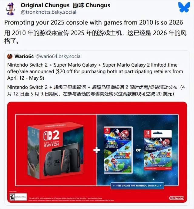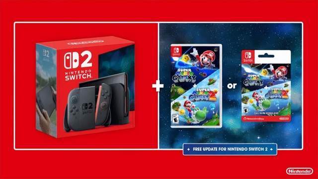 任天堂宣布,将于4月12日至5月9日,在美国推出新的主机游戏套装,内容为NS2主机,和《超级马里奥银河1+2》,无论是选择数字游戏还是实体游戏,都将享受20美元的折扣。