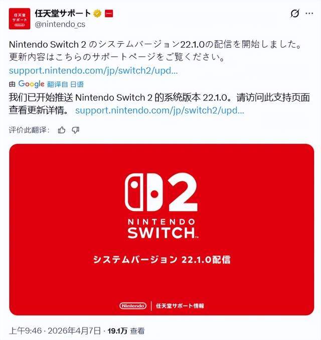 4月7日,任天堂推送NS和NS2的22.1.0更新。距离3月17日的22.0.0版本,差不多过去了20天时间。