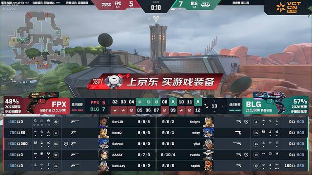 第八回合,BerLIN在C大拿下三杀终于帮助FPX拿下第一分。第九回合,FPX再追一分BLG叫出暂停。第十回合,双方在A点里的一波大混战最后由FPX拿下胜利。