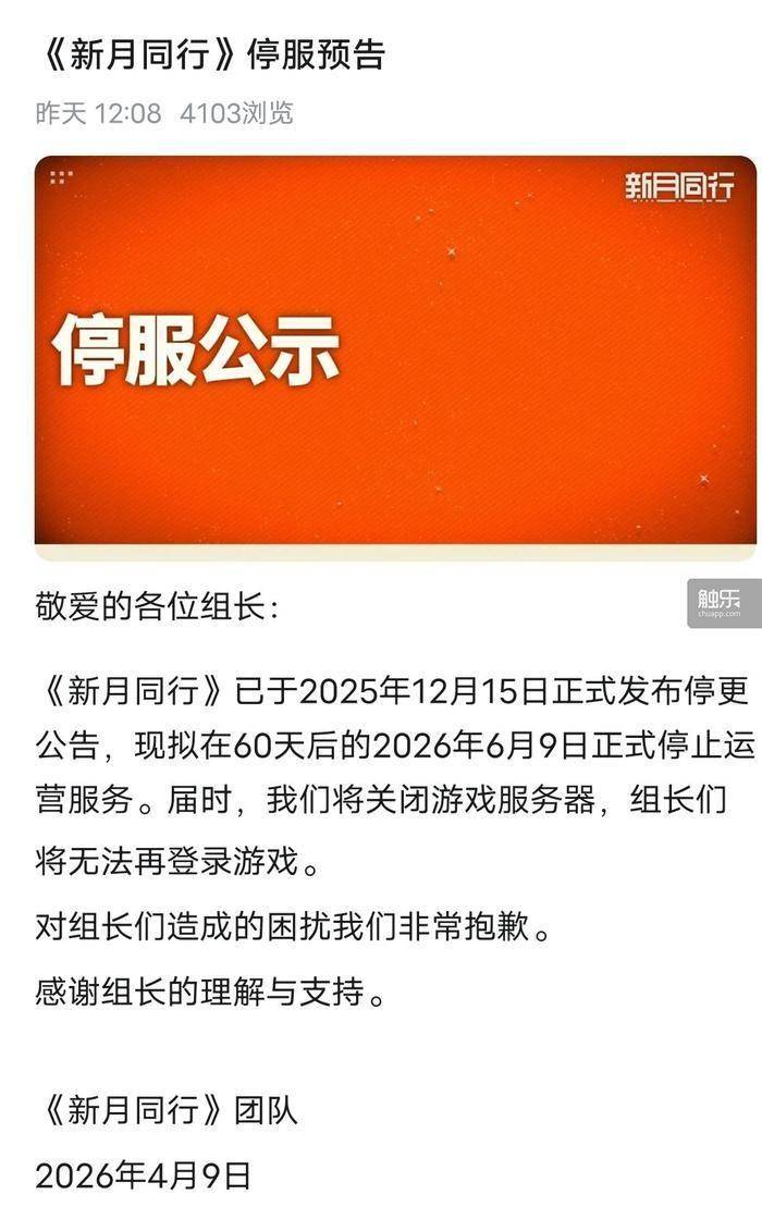 《新月同行》发布公告:游戏将于2026年6月9日正式停止运营