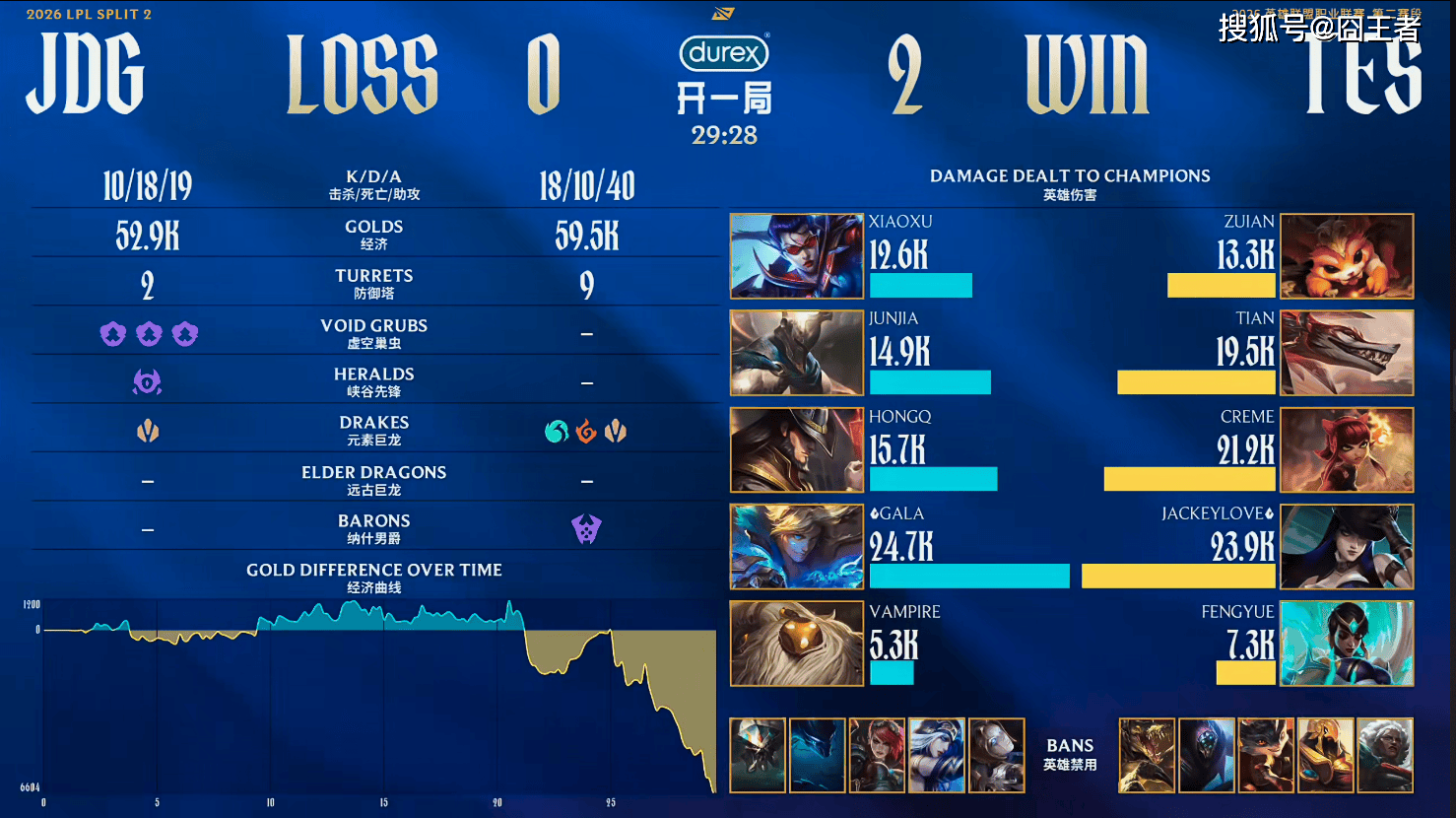 结果第二局比赛,两队依旧是各打了半场好局,所不同的是,这一次,又是TES笑到了最后。比赛前期,JDG依靠Xiaoxu薇恩打出的优势取得领先,但比赛第21分钟,Tian纳亚菲利带起节奏,TES先后打出1换5逆转劣势;比赛第25分钟,TES一波打出1换3后拿下大龙;比赛第26分钟,TES中路打出1换1后一波推进中路;最终比赛第29分28秒,Tian纳亚菲利怒砍四杀,TES一波结束比赛