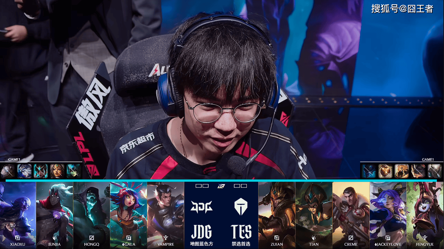 第一局比赛,JDG蓝色方,禁用:发条、艾希、卡尔玛、希维尔、娜美,选用:Xiaoxu掘墓、Junjia赵信、HongQ瑞兹、GALA韦鲁斯、Vampire妮蔻;TES红色方,禁用:潘森、兰博、沙皇、巴德、梦魇,选用:Zuian杰斯、Tian皇子、Creme蛇女、JackeyLove芸阿娜、fengyue璐璐