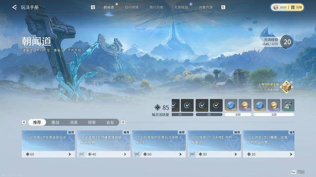 等级是大幅提升战力的关键所在,所以我们要优先提升等级,再通过其他方式来提升战力。而升级主要依靠主线任务和每日任务(朝闻道),对于轻度玩家来说,抓好这两个途径就能快速升级,而且还能护肝。