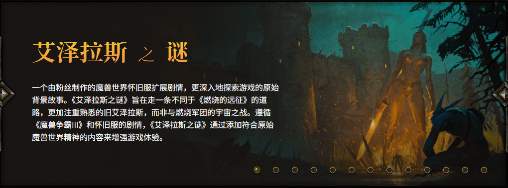 开发团队通过“艾泽拉斯之谜”的拓展包为游戏加入了许多自定义内容,包括新的种族、地图、技能以及副本等等。这些原创内容为玩家提供了独此一家的游戏体验。