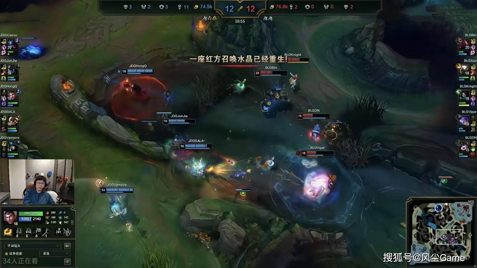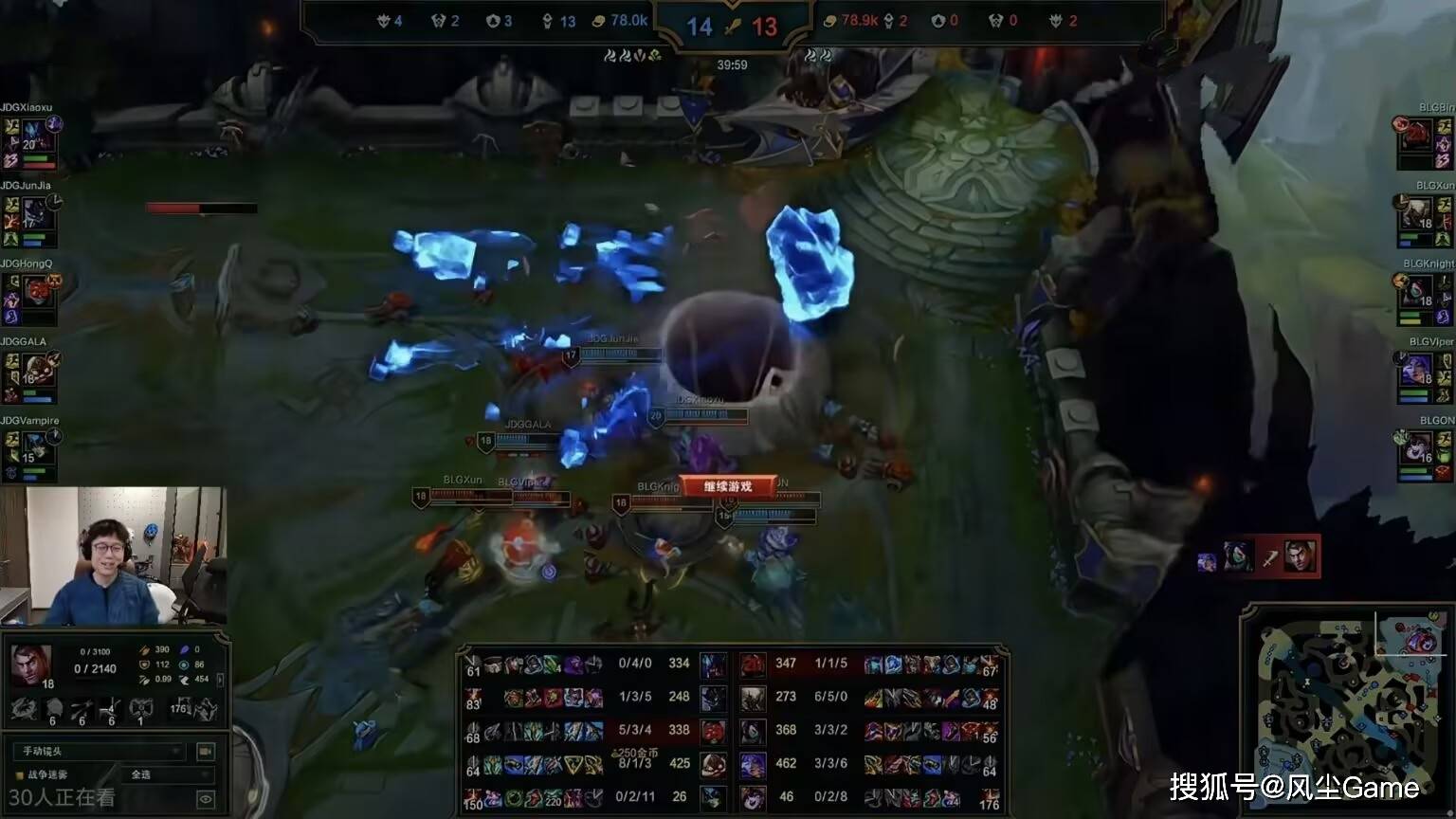 打到17分钟的时候,京东人头已经8:0领先了,结果小徐开始发力,带边线的时候,他连续被抓,给Viper送了2个头,26分钟京东突然灵机一动,在对面无人阵亡的情况下打大龙,结果除了嘎子全部阵亡,BLG吃了大人头之后,经济逐渐反超,但最关键的龙魂团,BLG下路突然出问题了。