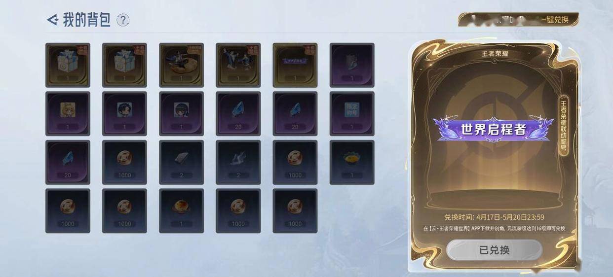 时装和其中一款武器是注册成功就可以领取的,有一款武器需要搭配王者荣耀世界角色等级的24级,称号是16级。