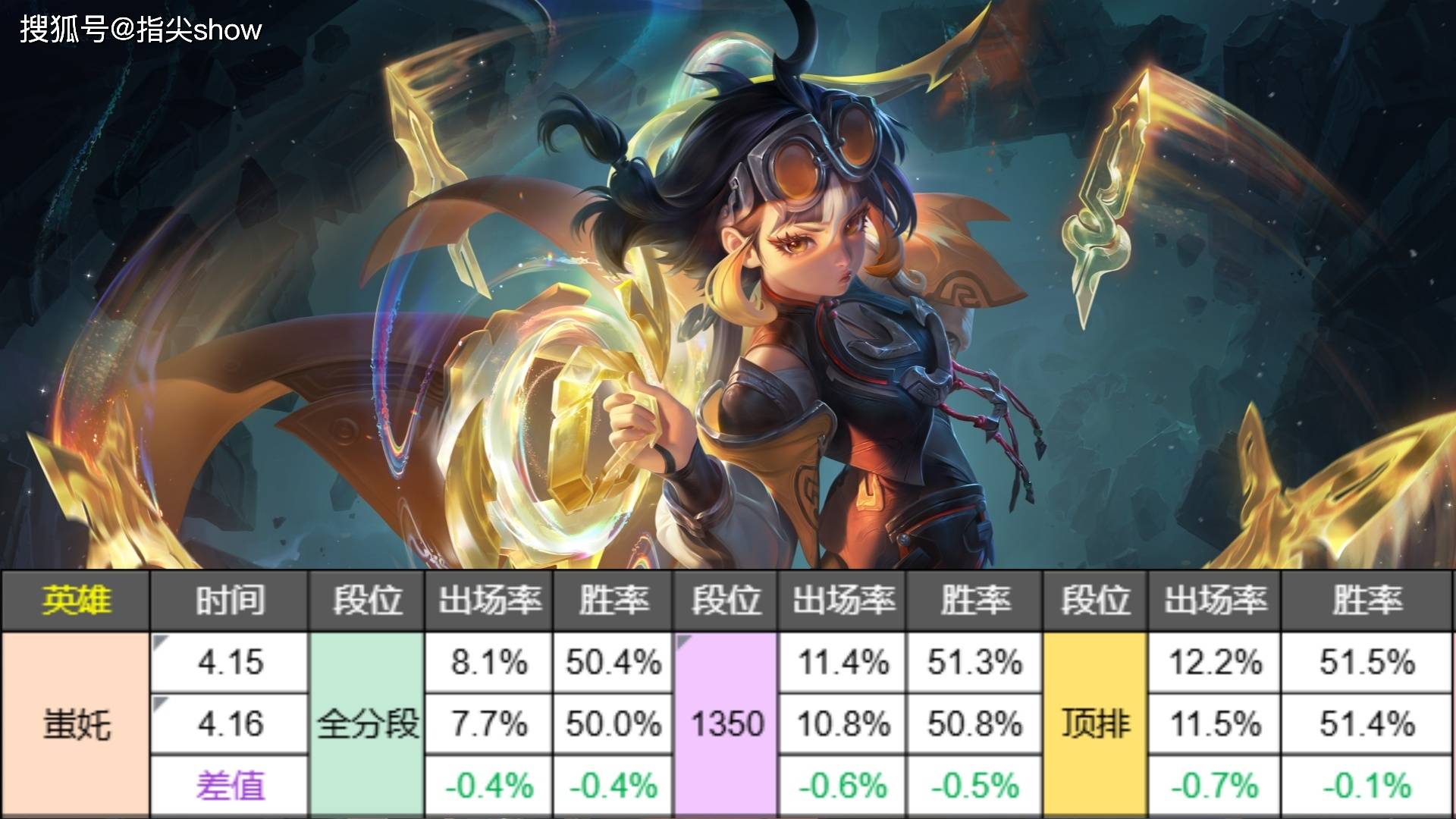 所以调整之后,蚩奼的数据波动很小,最大也不过0.5%而已,依然处在一个出场率和胜率均在线的强势状态,该玩玩,你甚至体验不出来蚩奼削弱了。