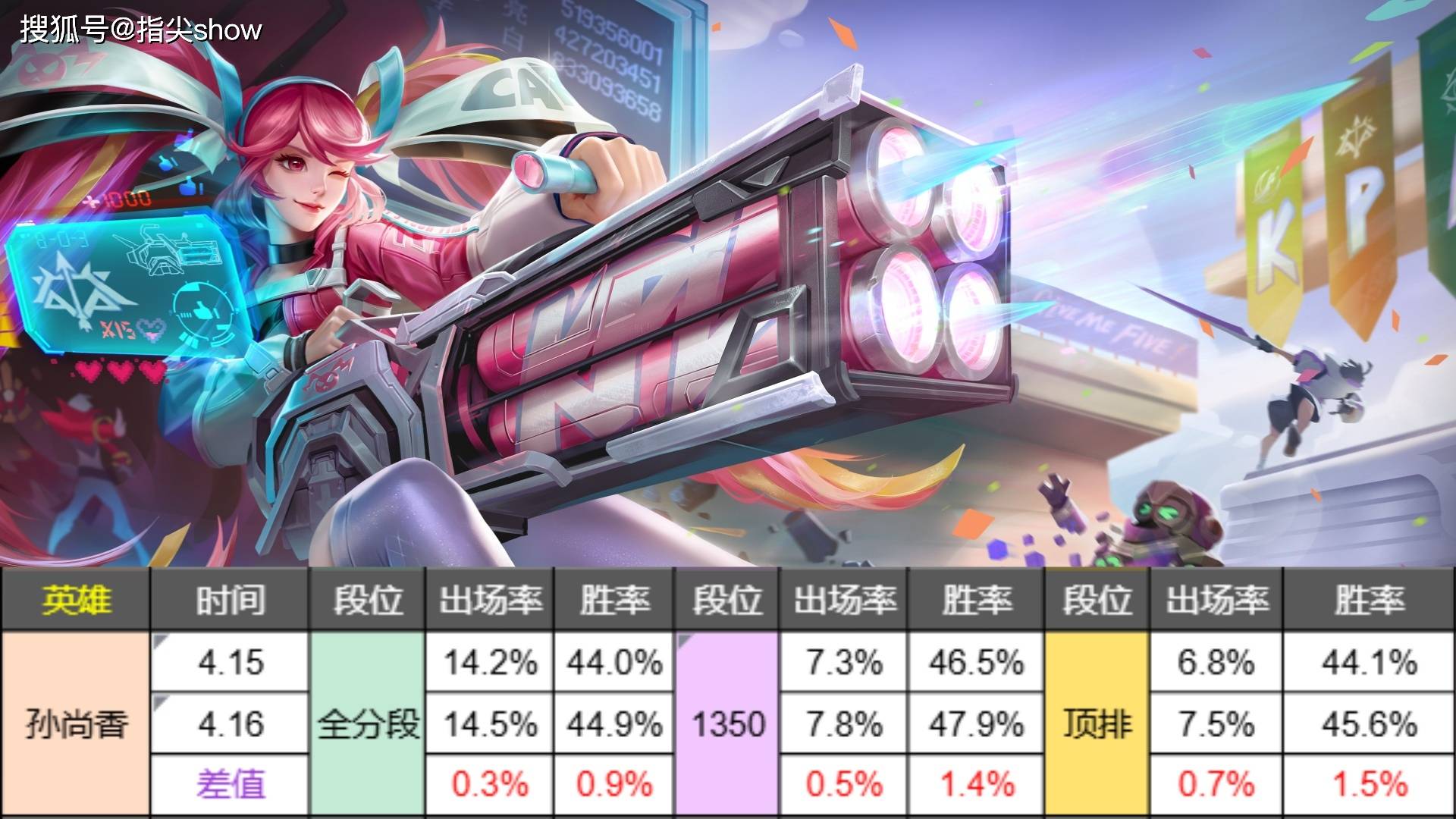 从结果来看,出场率波动不大,因为很多人都并不是很看好这个调整,胜率方面最高顶排涨幅1.5%还不错,但如果只是这样的数据,还达不到摆脱泥坑的地步,各分段胜率 依然是垫底的状态,我觉得策划该在其他方面多努力一下,哪怕给二技能的破甲增加5%。