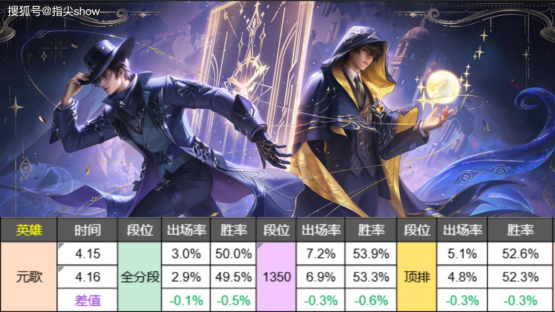 元歌的调整是削弱带补偿,因此数据出来后可以看到,并没有出现明显的下滑趋势,全分段的数据不用看,看巅峰赛和顶排就好,元歌依然人上人,只要你能驾驭这个英雄,绝对还是好上分的。