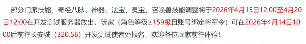 这次应该会有召唤兽技能调整,大家也可以关注一下。目前的报名条件还是和之前一样,角色等级≥159级且账号绑定将军令,就可以前往长安城(320,58)开发测试使者处报名。