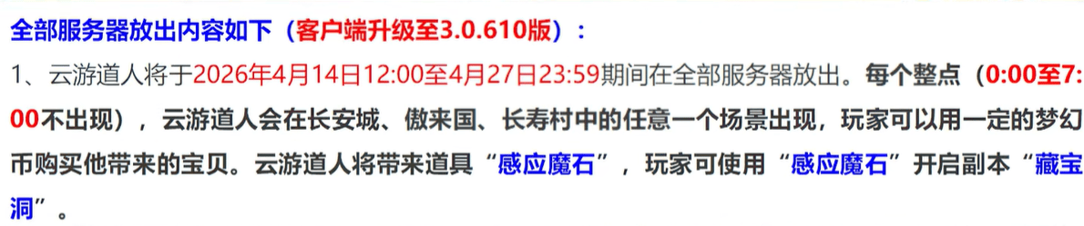 今日维护后,云游道人将正式登陆全服,本次出现时间为4月14日12:00至4月27日23:59,出现地点和规则和之前一致。