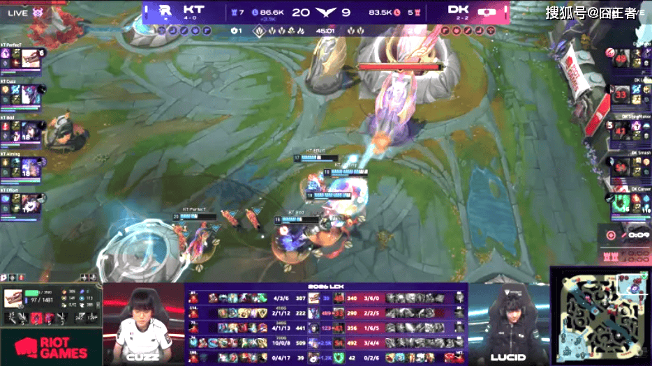结果第二局比赛,两队使出浑身解数,各打了半场好局,特别是DK,在领先6000的情况,愣是被KT反打成功,KT赢下比赛。前中期,DK运营得当,打出了领先6000的经济优势,正当玩家以为事情就这样结束的情况下,KT出手了。