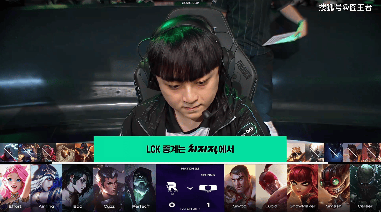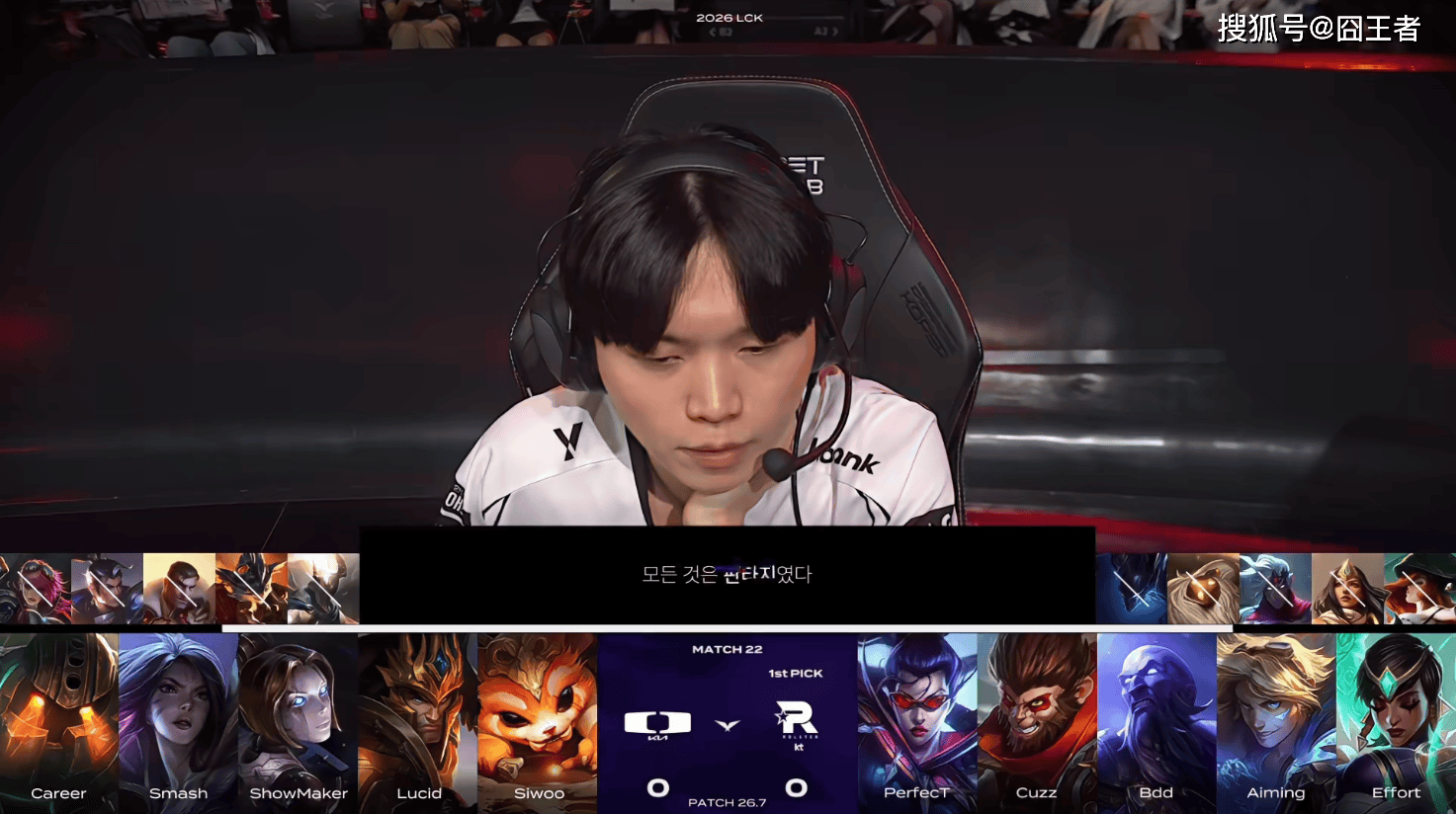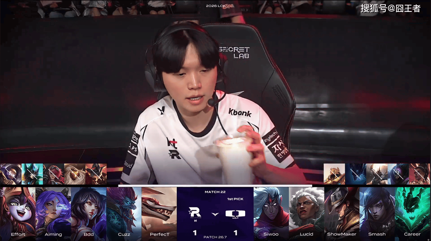第一局比赛,DK蓝色方,禁用:潘森、兰博、杰斯、赵信、蔚,选用:Siwoo纳尔、Lucid皇子、ShowMaker发条、Smash卡莎、Career泰坦;KT红色方,禁用:NOC、巴德、韦鲁斯、轮子妈、女枪,选用:PerfecT 薇恩、Cuzz猴子、Bdd瑞兹、Aiming EZ、Peter卡尔玛